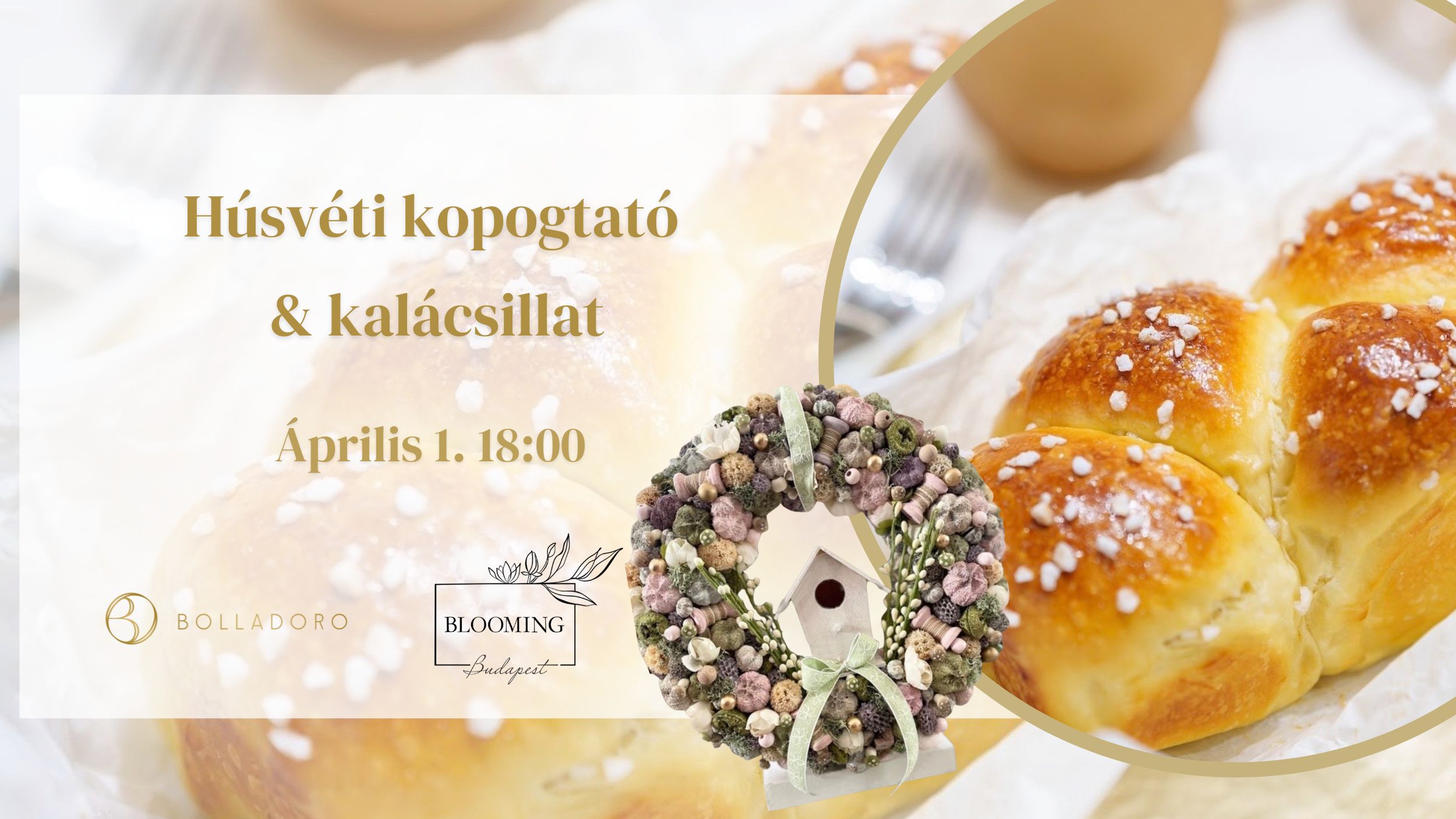 A Bloominggel közösen egy hangulatos húsvéti workshopra várunk, ahol saját húsvéti kopogtatót készíthetsz természetes díszekkel, madárka házikóval, tavaszi részletekkel, közben pedig együtt sütünk foszlós húsvéti kalácsot, és tipikus húsvéti aprósüteménnyel készülünk.